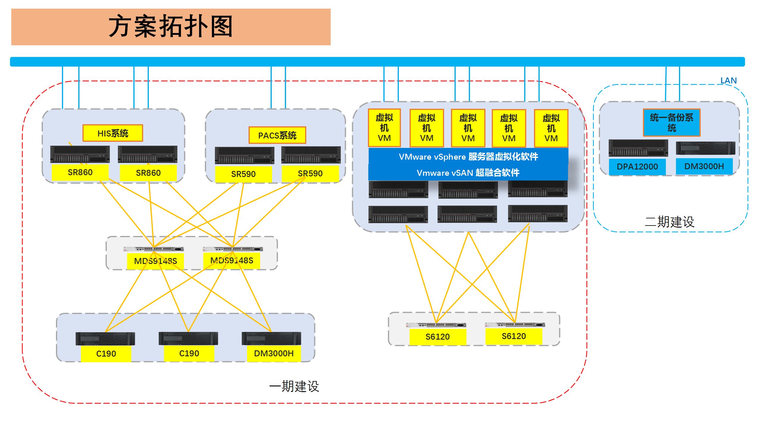 基于吳起縣人民醫(yī)院的實際需求,在預(yù)算非常有限的情況下,藍(lán)島科技攜手聯(lián)想提供了令用戶滿意的解決方案,方案以聯(lián)想ThinkSystem SR860作為HIS系統(tǒng)服務(wù)器,SR860采用英特爾至強可擴展處理器,為HIS系統(tǒng)的運行提供了卓越的速度和可靠性;部署2臺NetApp C190通過SnapMirror-Business Continuity方式實現(xiàn)存儲級雙活;部署1臺DM3000H主要運行PACS數(shù)據(jù)庫,未來通過SnapMirror,組成高可用環(huán)境;以6*VX5520構(gòu)建基于vSAN的超融合虛擬化資源池,搭載起吳起縣人民醫(yī)院的其他業(yè)務(wù)系統(tǒng),實現(xiàn)統(tǒng)一管理,彈性調(diào)度,靈活分配。
