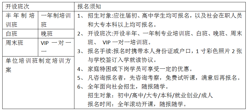 專業(yè)設(shè)置 辦公自動(dòng)化 計(jì)算機(jī)“零"基礎(chǔ)知識(shí)學(xué)習(xí),標(biāo)準(zhǔn)輸入法/文字排版/表格制作/幻燈片制作 廣告設(shè)計(jì) 文字排版/表格制作/圖片繪制/特效合成/平面廣告設(shè)計(jì)制作/實(shí)訓(xùn) 影視制作 傳媒影視編輯/視頻剪輯/合成/調(diào)色特效/輸出/實(shí)訓(xùn) 建筑裝飾 效果圖繪制/平面廣告設(shè)計(jì) 工程圖紙?jiān)O(shè)計(jì)/實(shí)訓(xùn) 1單位定制辦公培訓(xùn) 2計(jì)算機(jī)等級(jí)考試培訓(xùn) 3單位培訓(xùn) 場(chǎng)地租賃 4學(xué)生信息課 考試培訓(xùn)